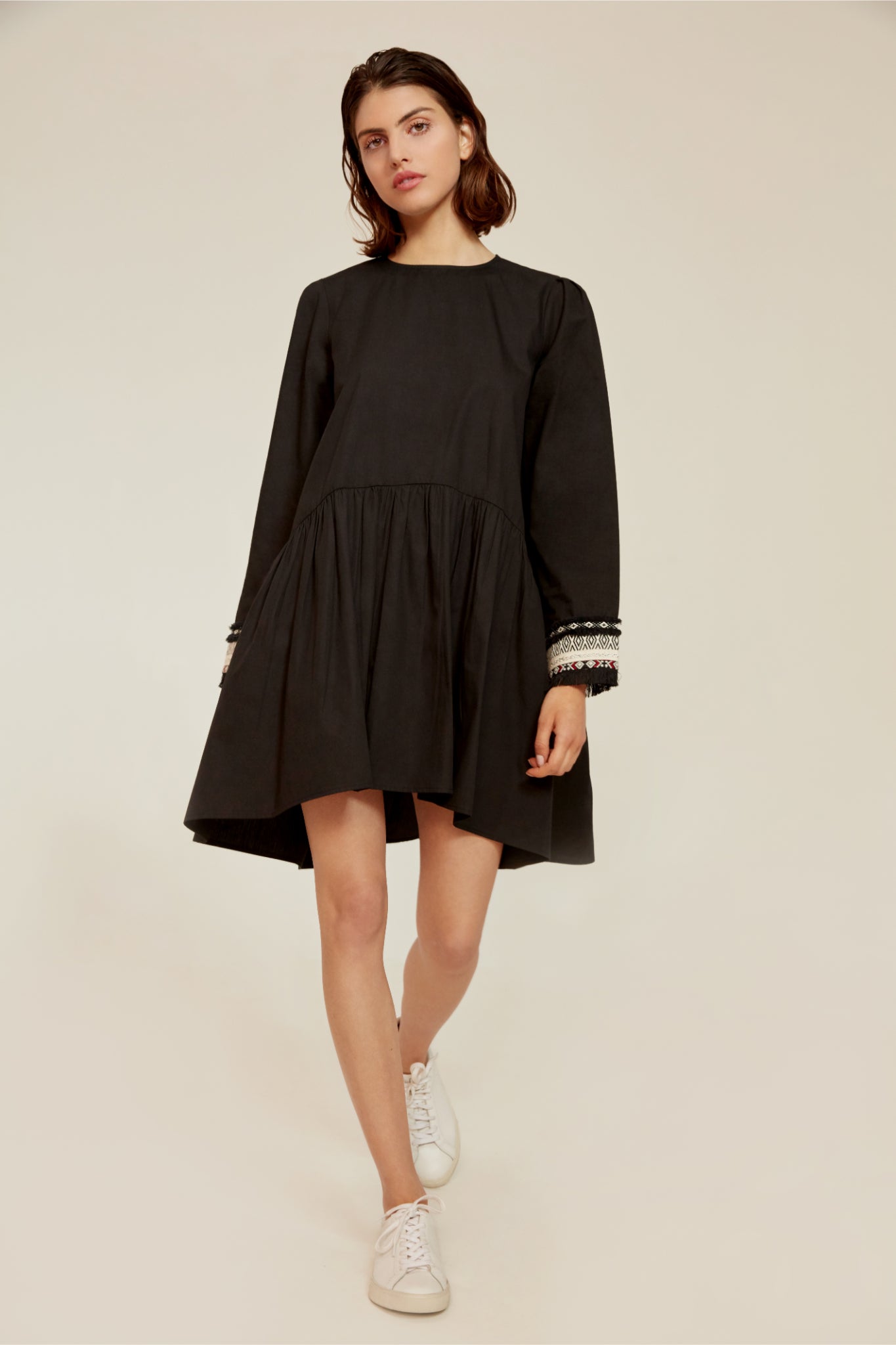 An elegant mini dress with an asymmetric skirt and incredible hand embroidered details on the sleeve cuffs.