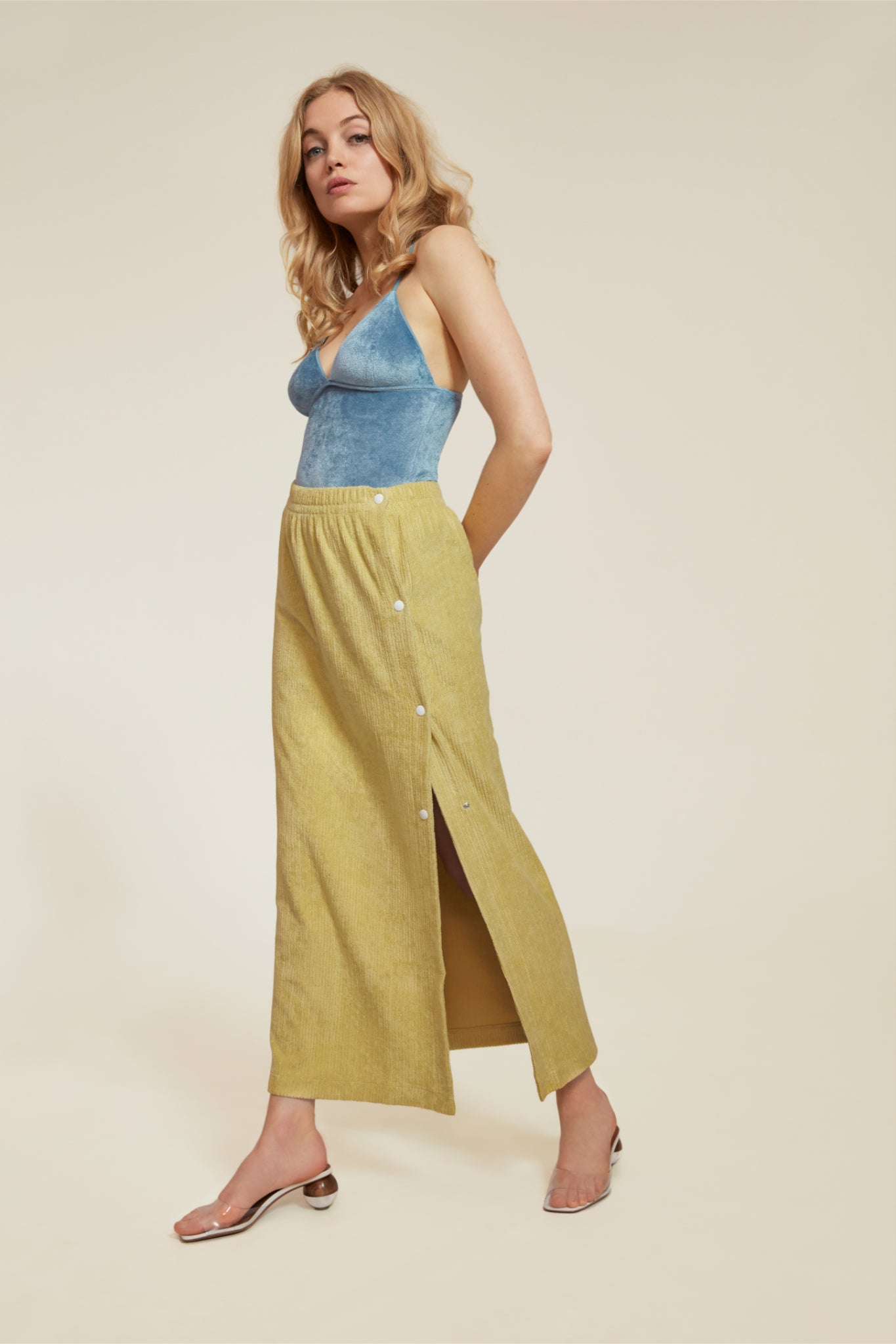 A high waisted skirt that is a pleasure to wear not only because of the superbly soft ribbed terry fleece fabric that will quite literally have you feeling yourself, but the subtle detail of an a line shape will do your outfit a world of good. The buttons allow you to be as daring or demure as you feel.