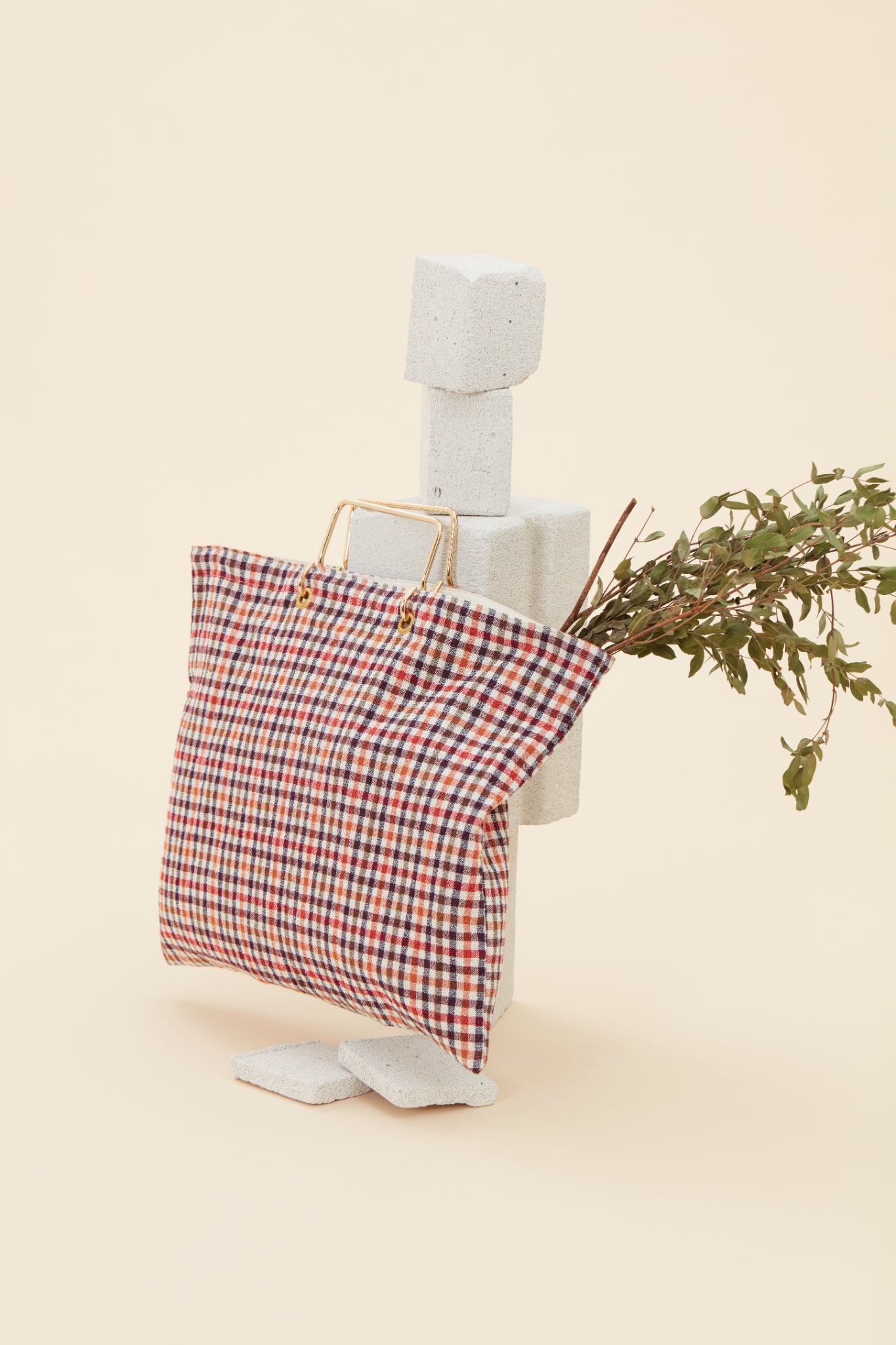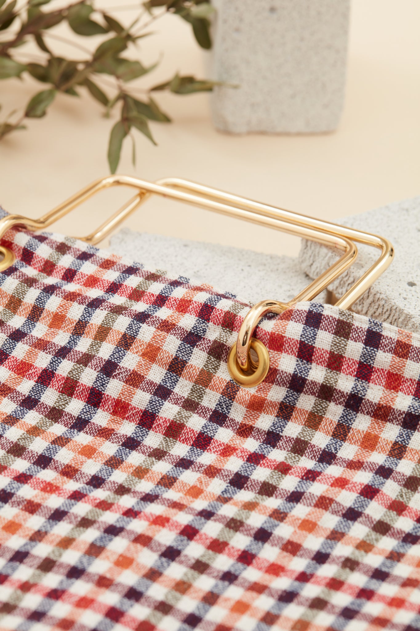 A checked tote bag with stunning rectangular gold handles. Pretty enough to turn your standard into something fun, and roomy enough to be certain you have everything with you.