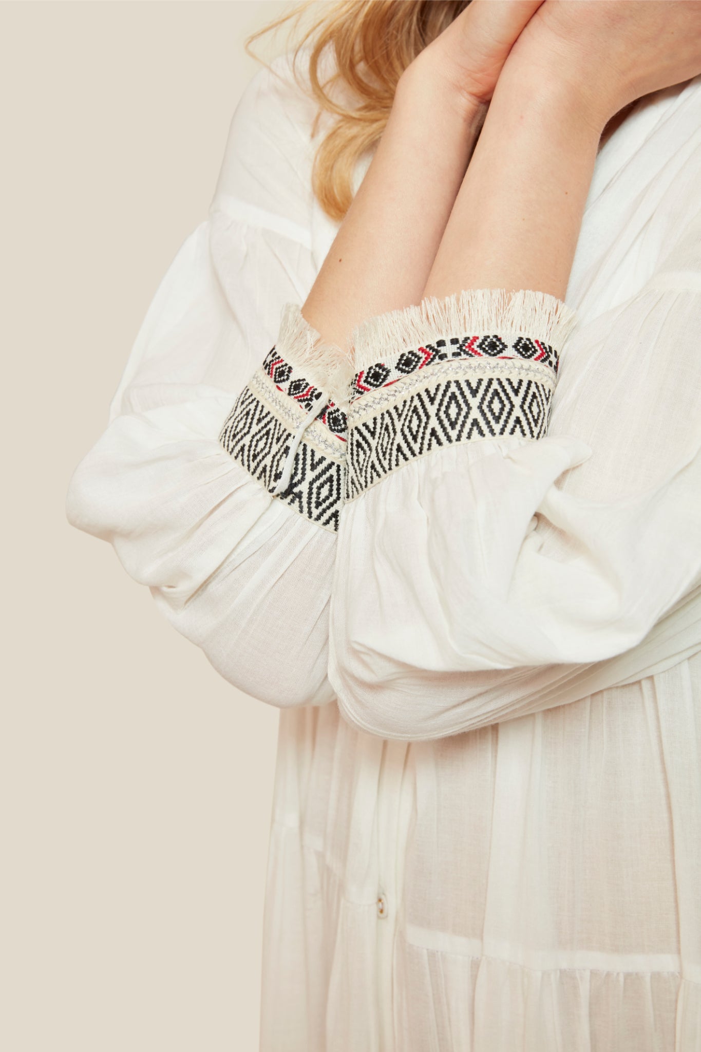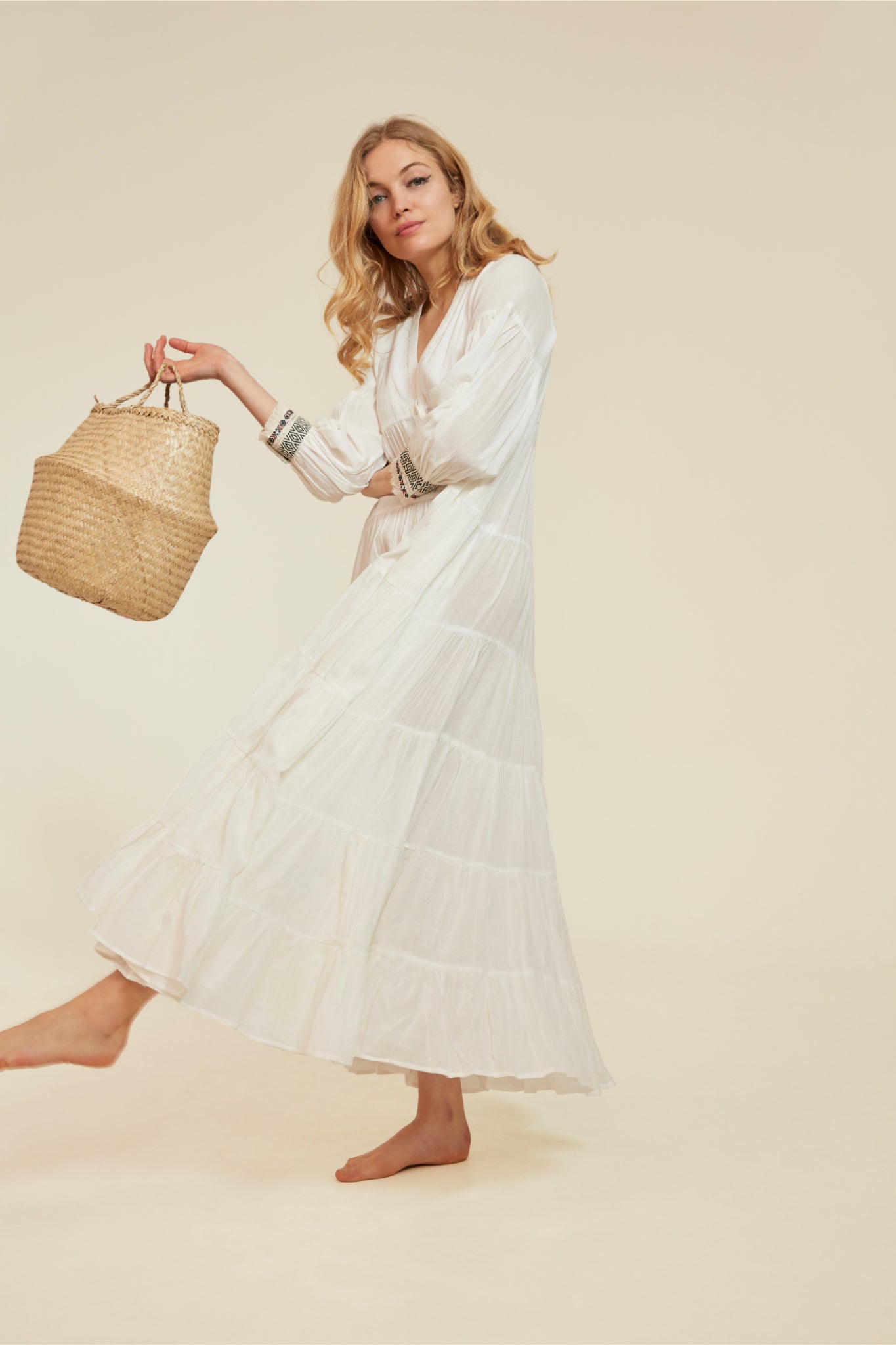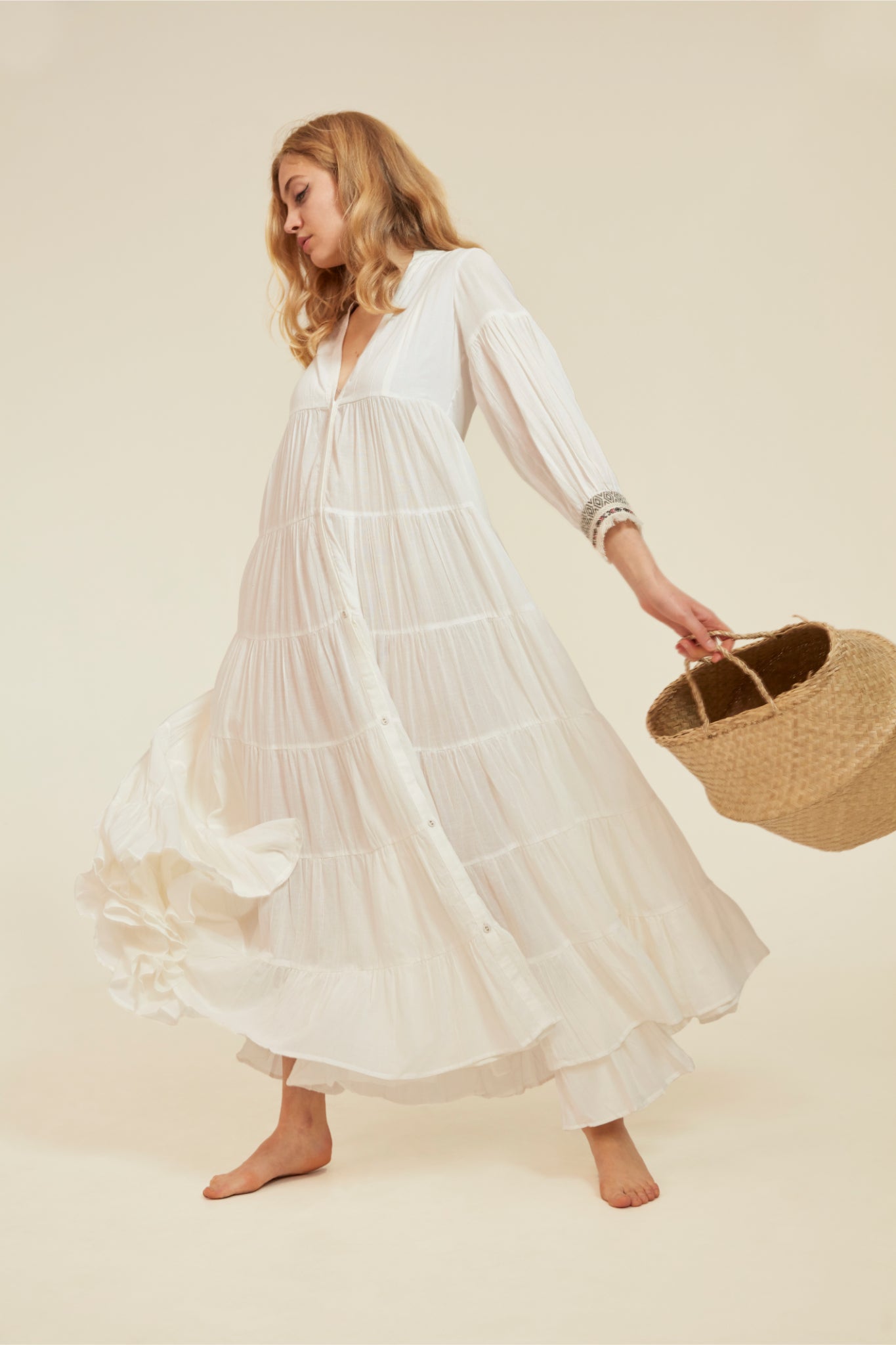 A beautiful maxi dress that helps you achieve that carefree look even on days where you feel pretty far from that but still want to look the part. The layers are sure to make you twirl in delight once you have this on and we promise you don't have to be a princess for this effect, it just does that to you. With a button down fastening to leave as open as you please and embroidered details on the sleeve cuffs too.