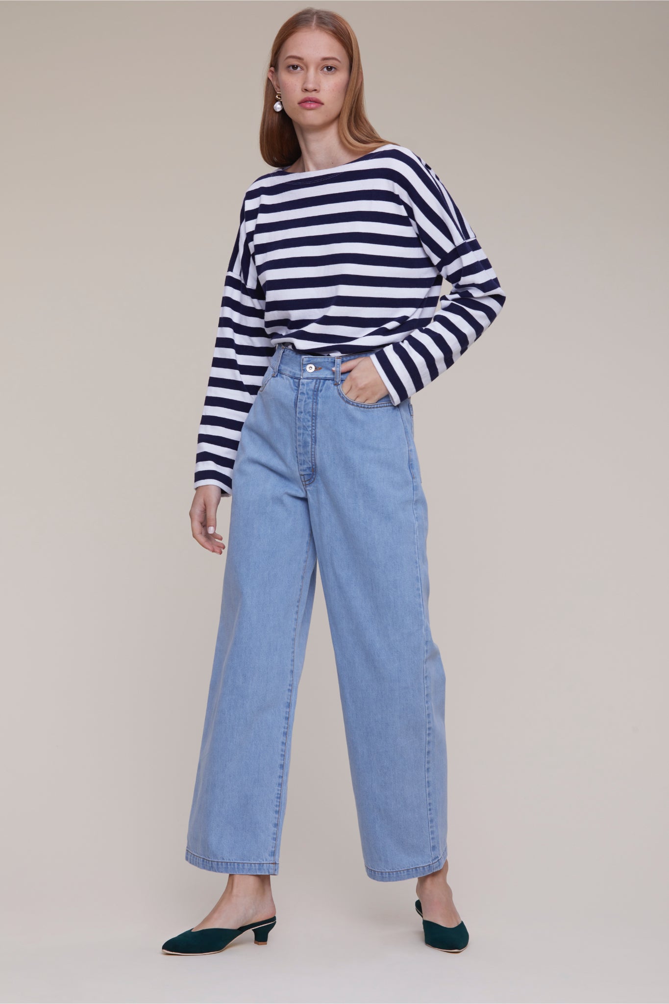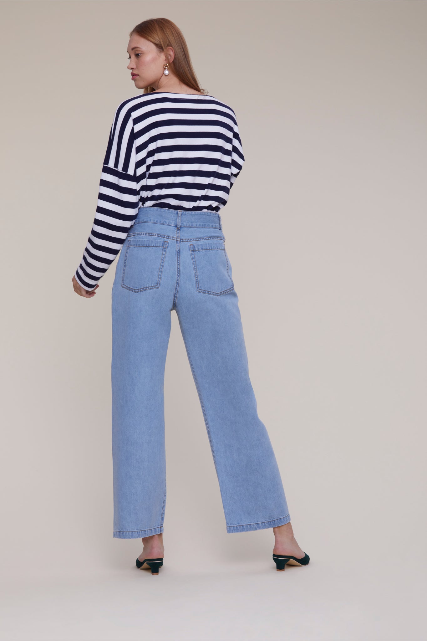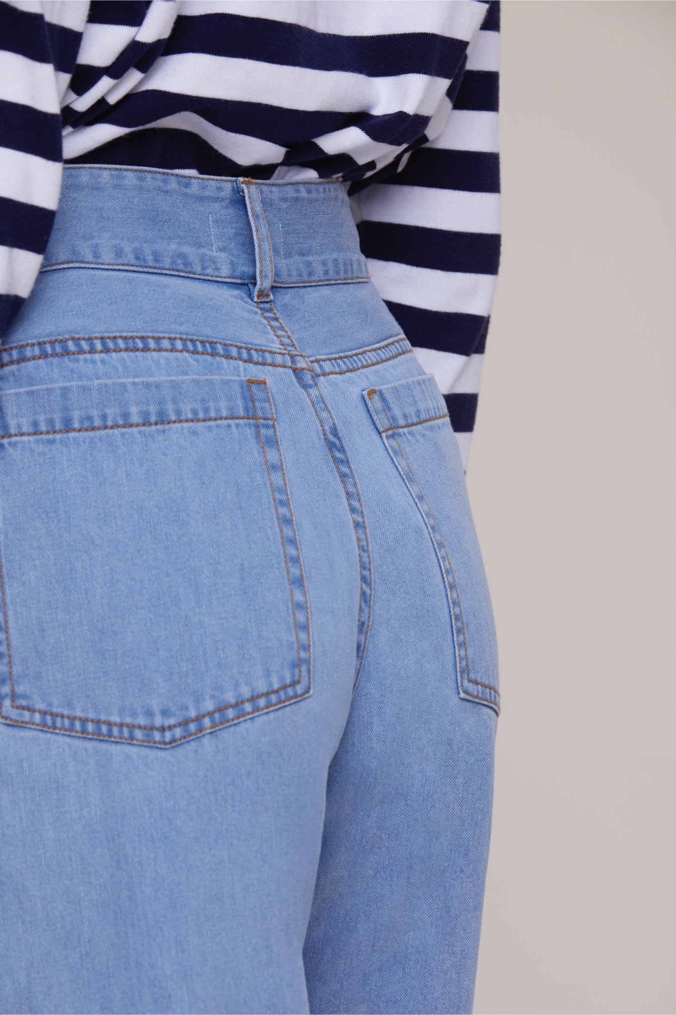 High waisted jeans with a straight, wide leg. It will be a struggle to not wear these with anything and everything, so why stress yourself, please wear these with anything and everything. They are made with organic cotton so you really should do.