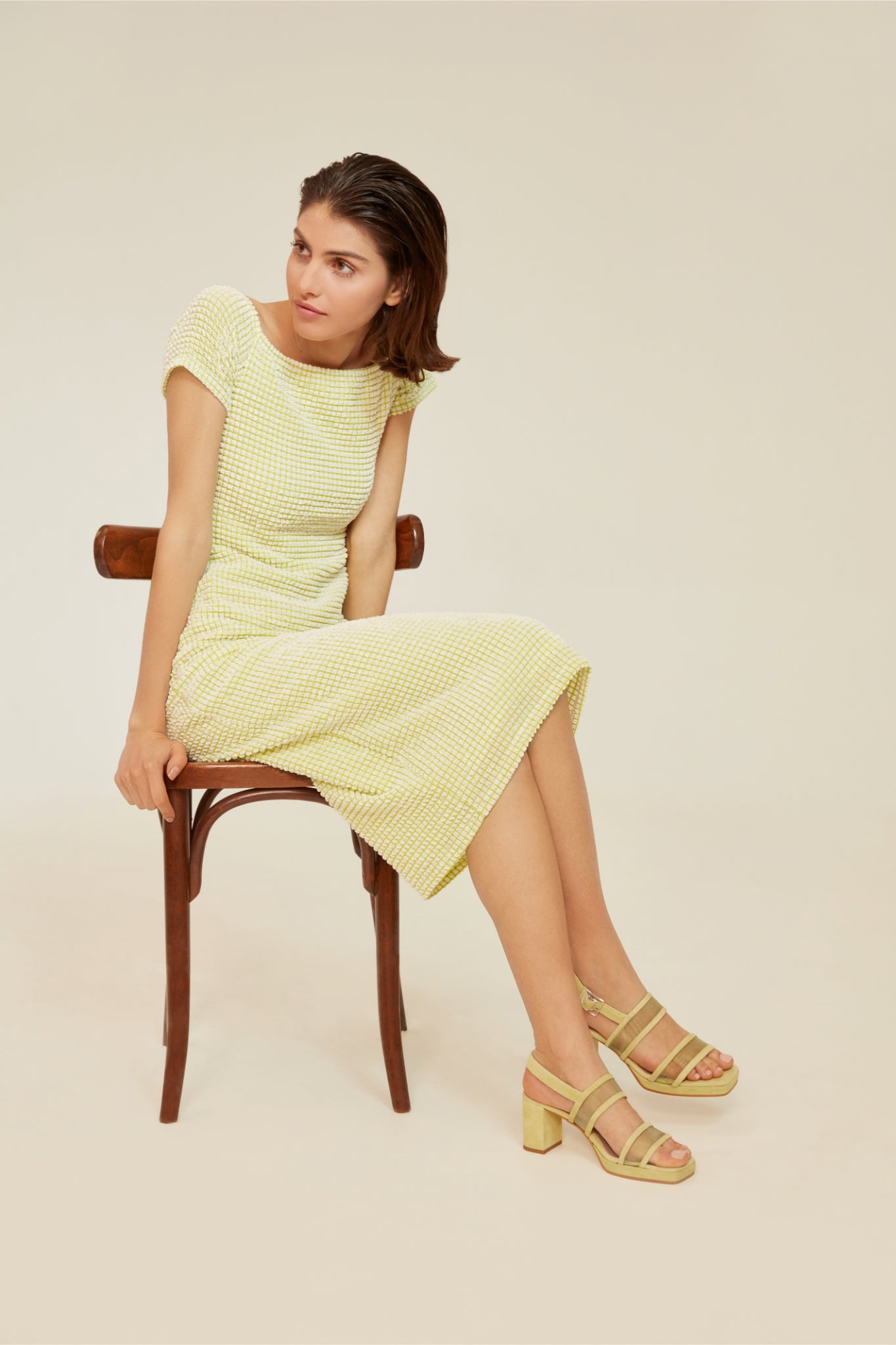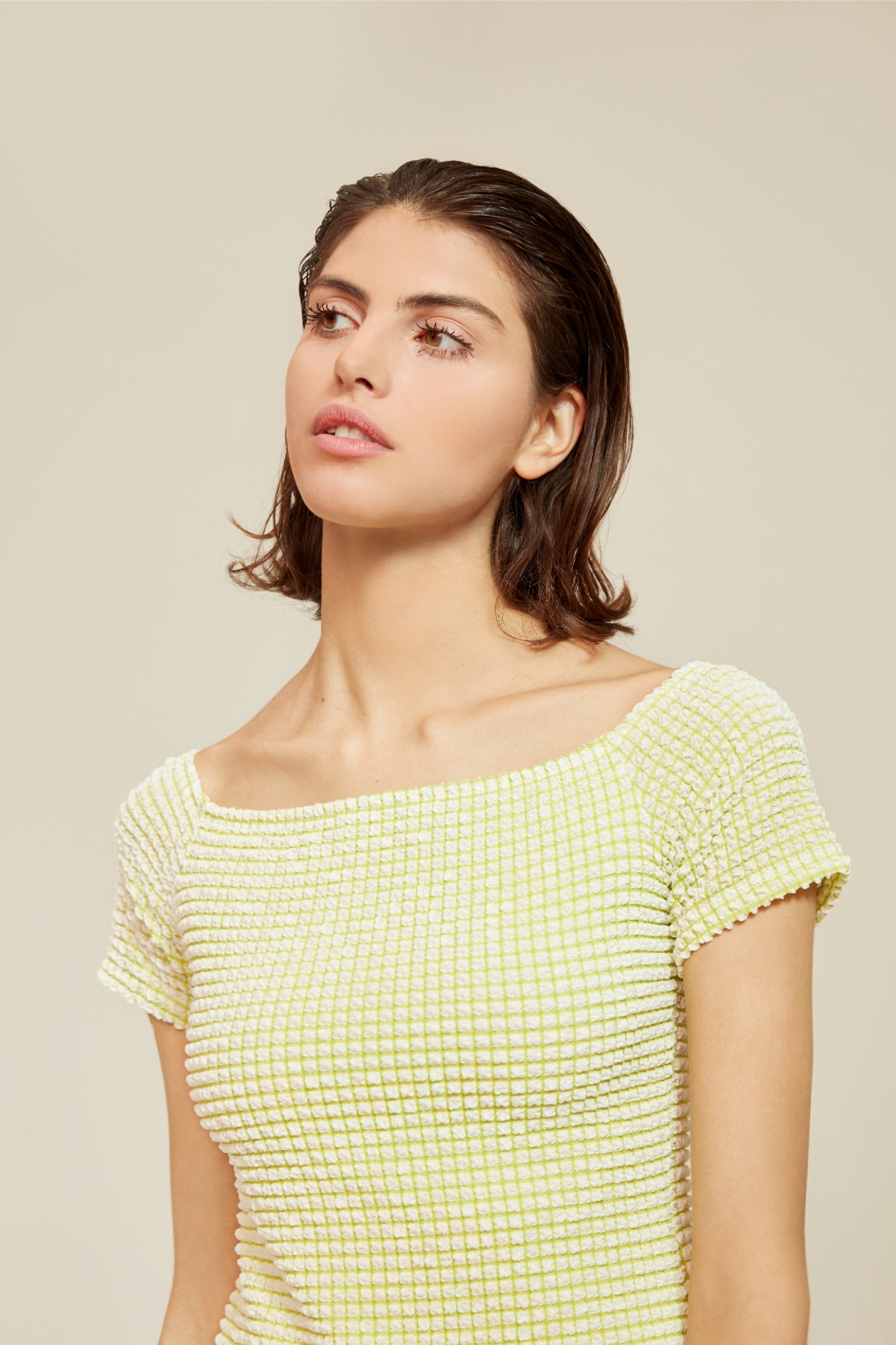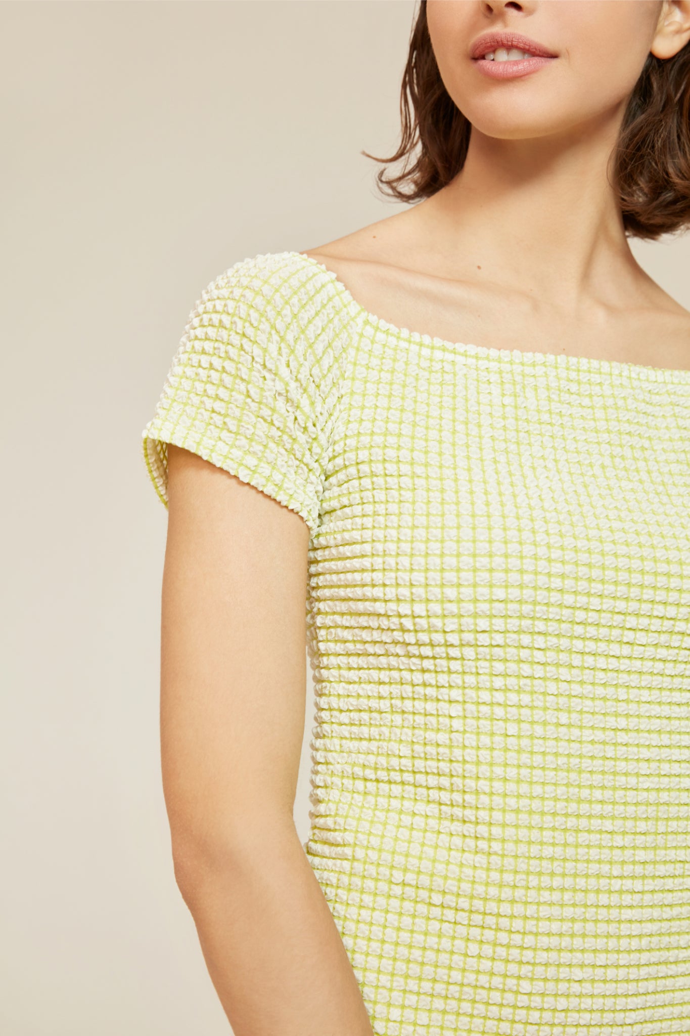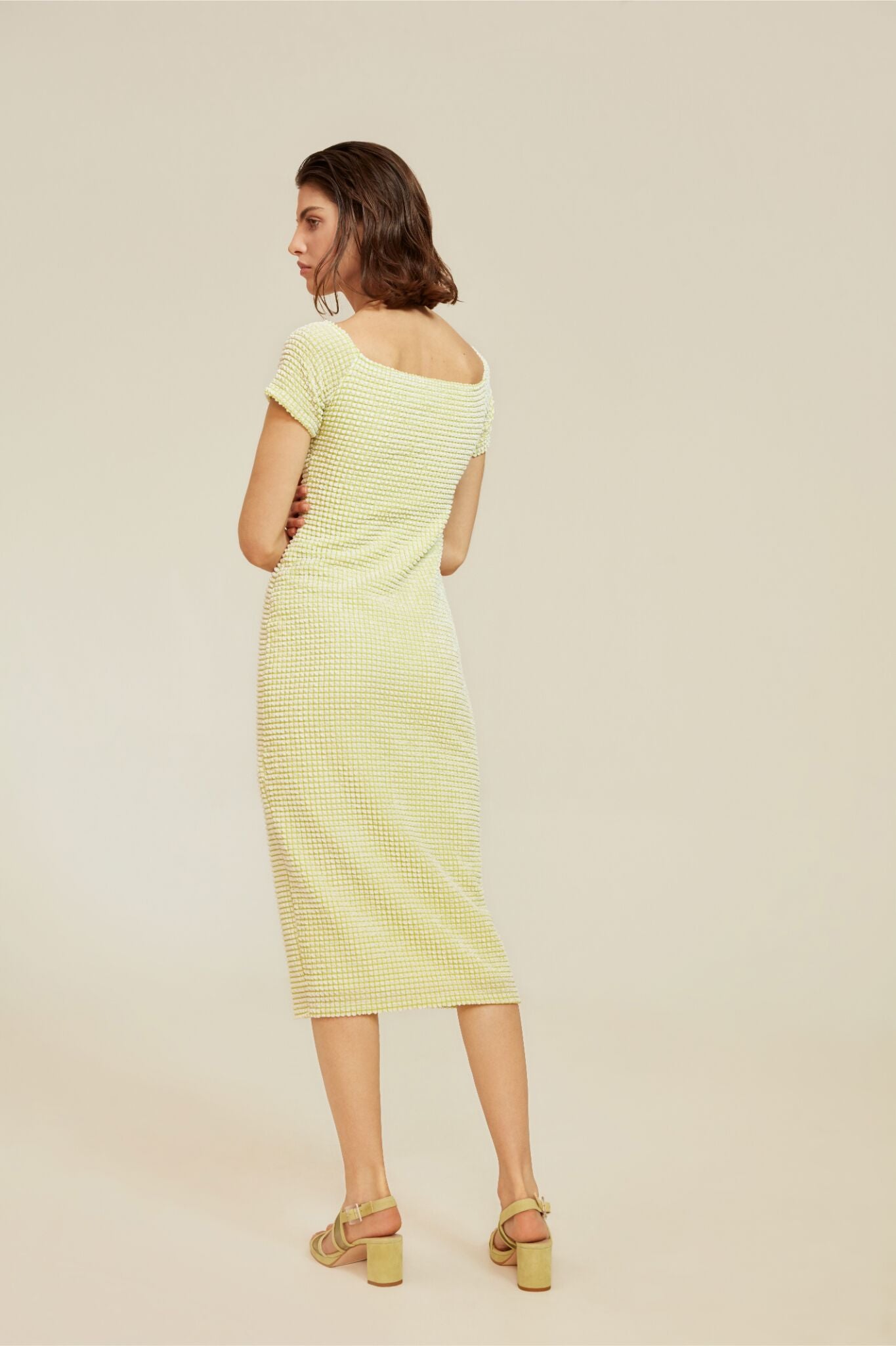 We do love an off the shoulder item and who doesn't love a bit of fun nostalgia. This knee length dress is beautifully textured with a crinkle-stretch fabric that will make you place yourself in the colourful world of the 80s. Yes things may have moved on quite a bit from then but our desire to look the part doesn't seem to be budging so feed it to the brim with this pretty form-fitting piece.