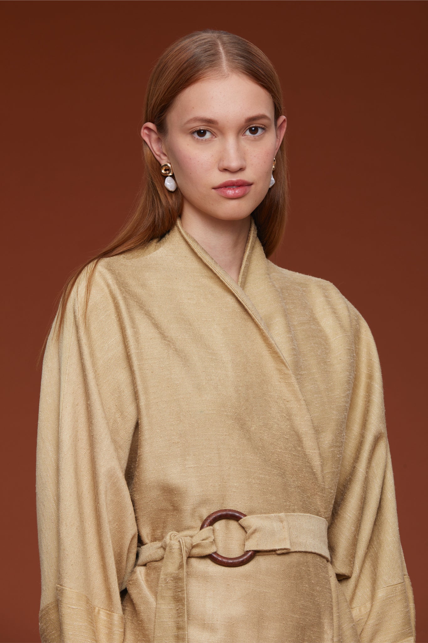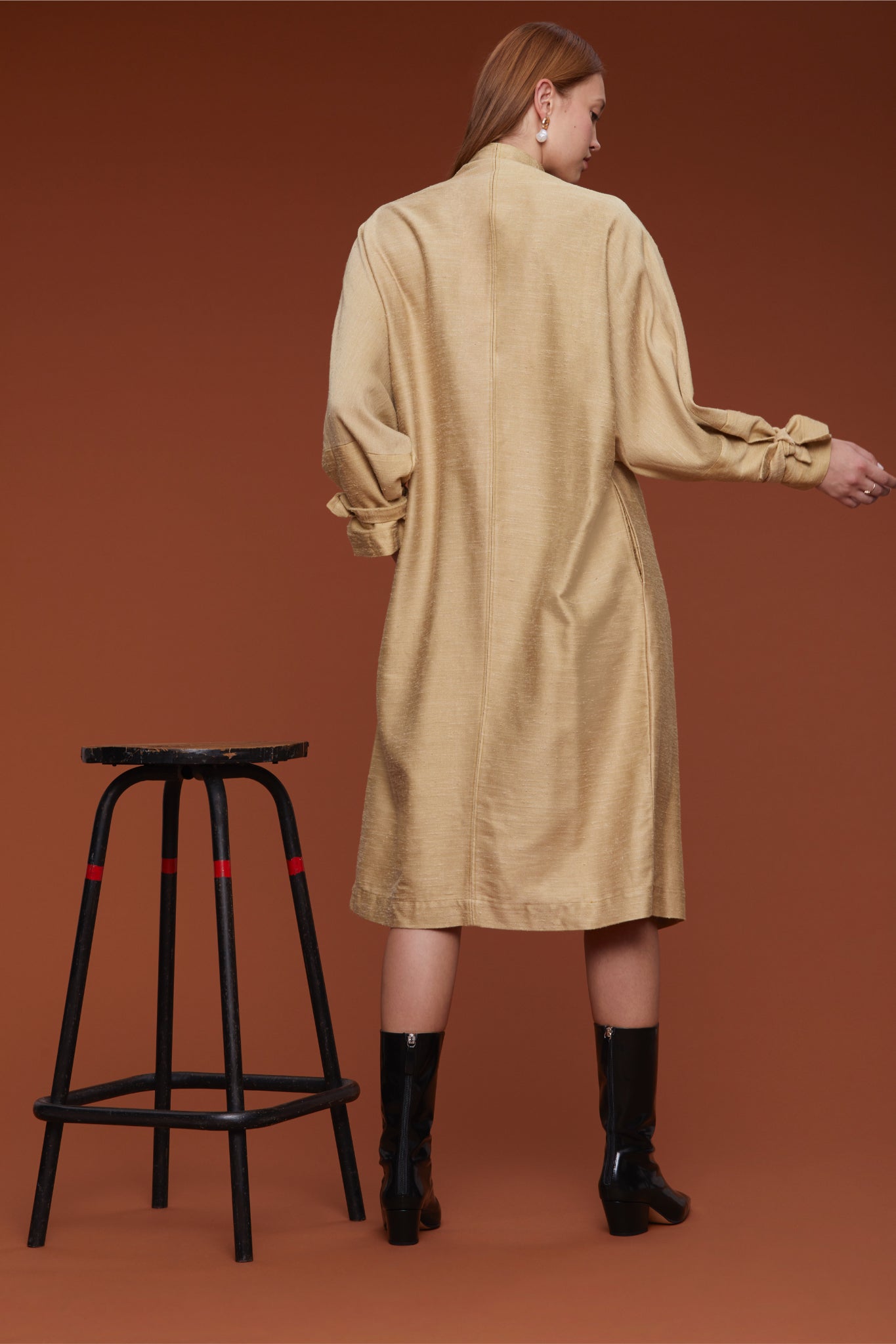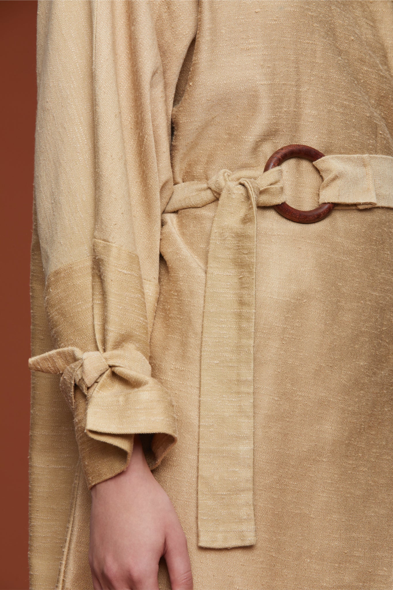 A trench for the Gods. The Sophie has a crossover front and adjustable belted cuffs which create a beautiful, minimal puff sleeve. It comes with a belt that is enclosed with a lovely wooden ring - perfect for a woman on a mission.