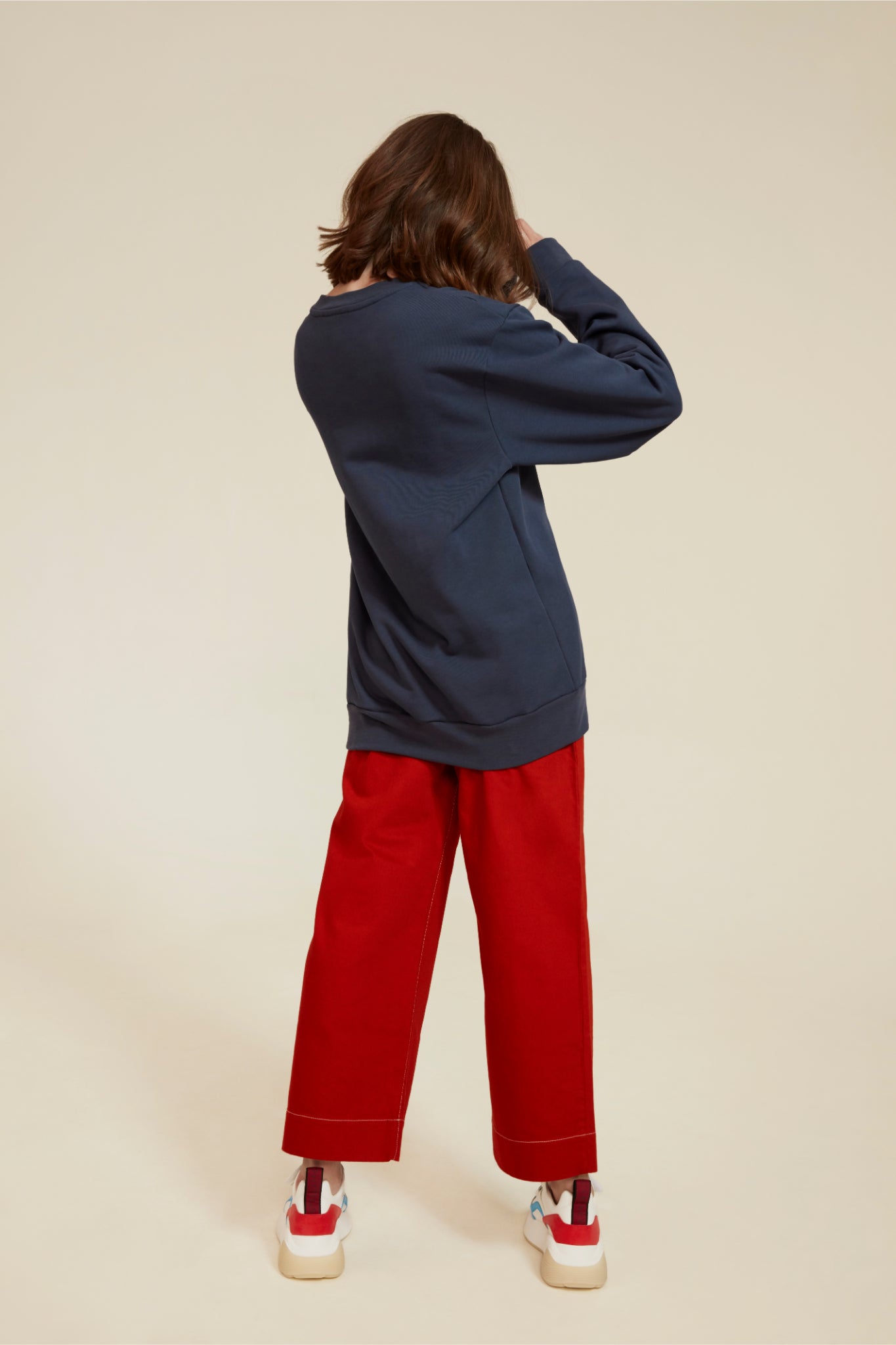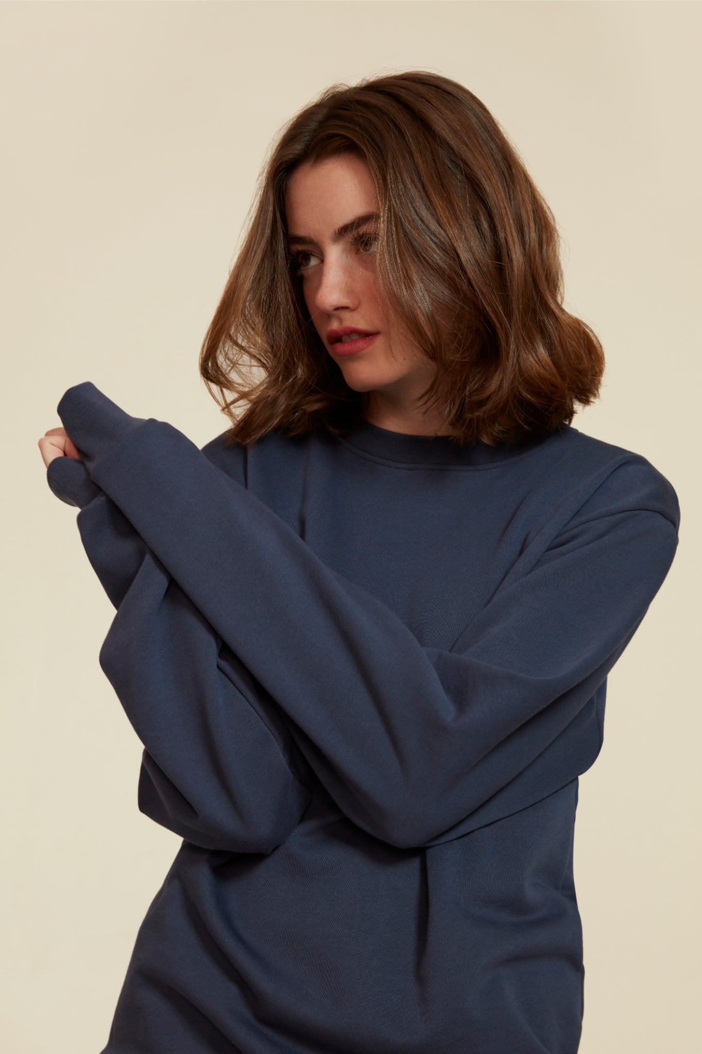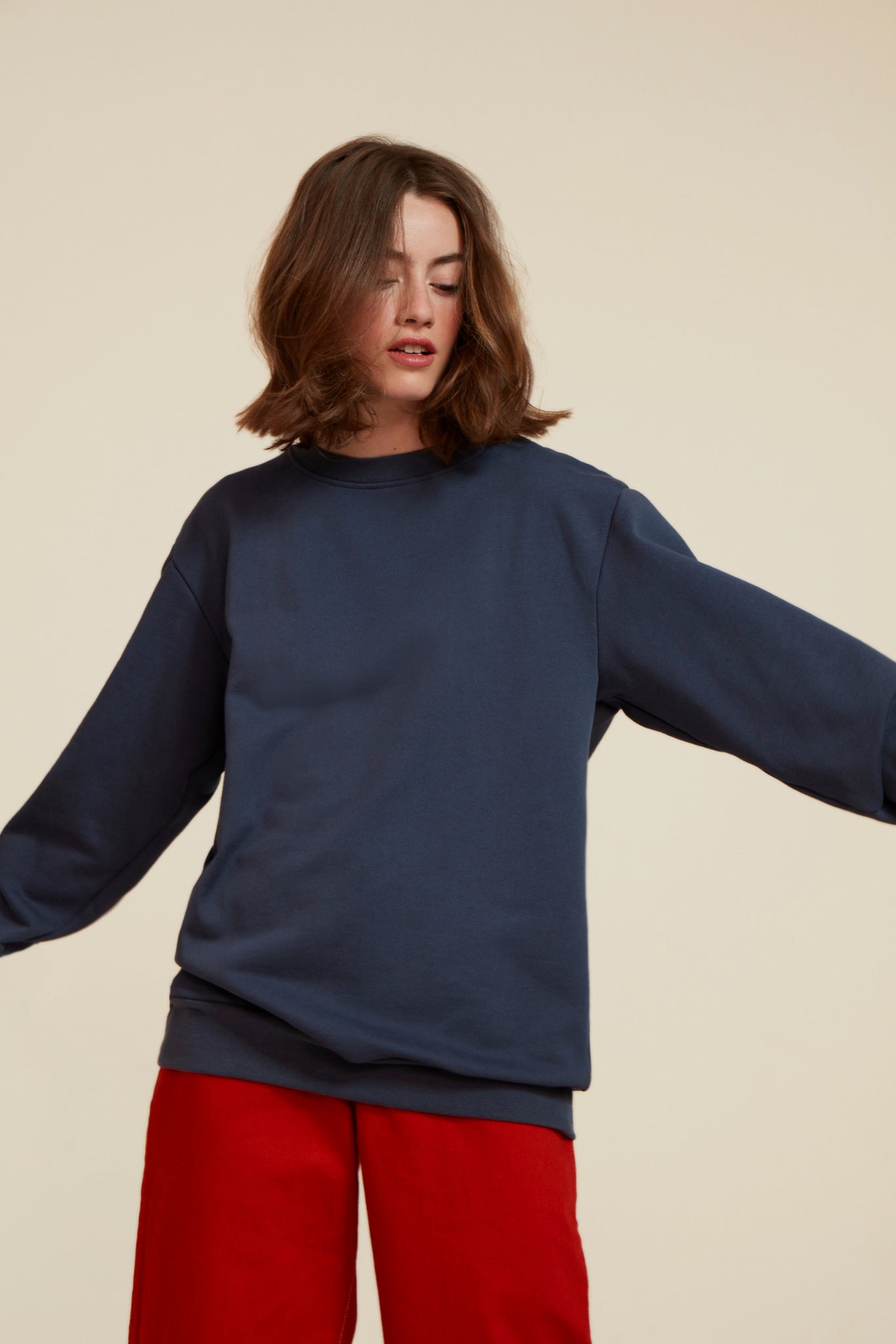 Plain navy sweatshirt in organic cotton, that will make a great layer for when those summer nights get that little bit too chilly. Classic ribbing along the hem and neckline, and also a dropped shoulder for that ultimate casual look.