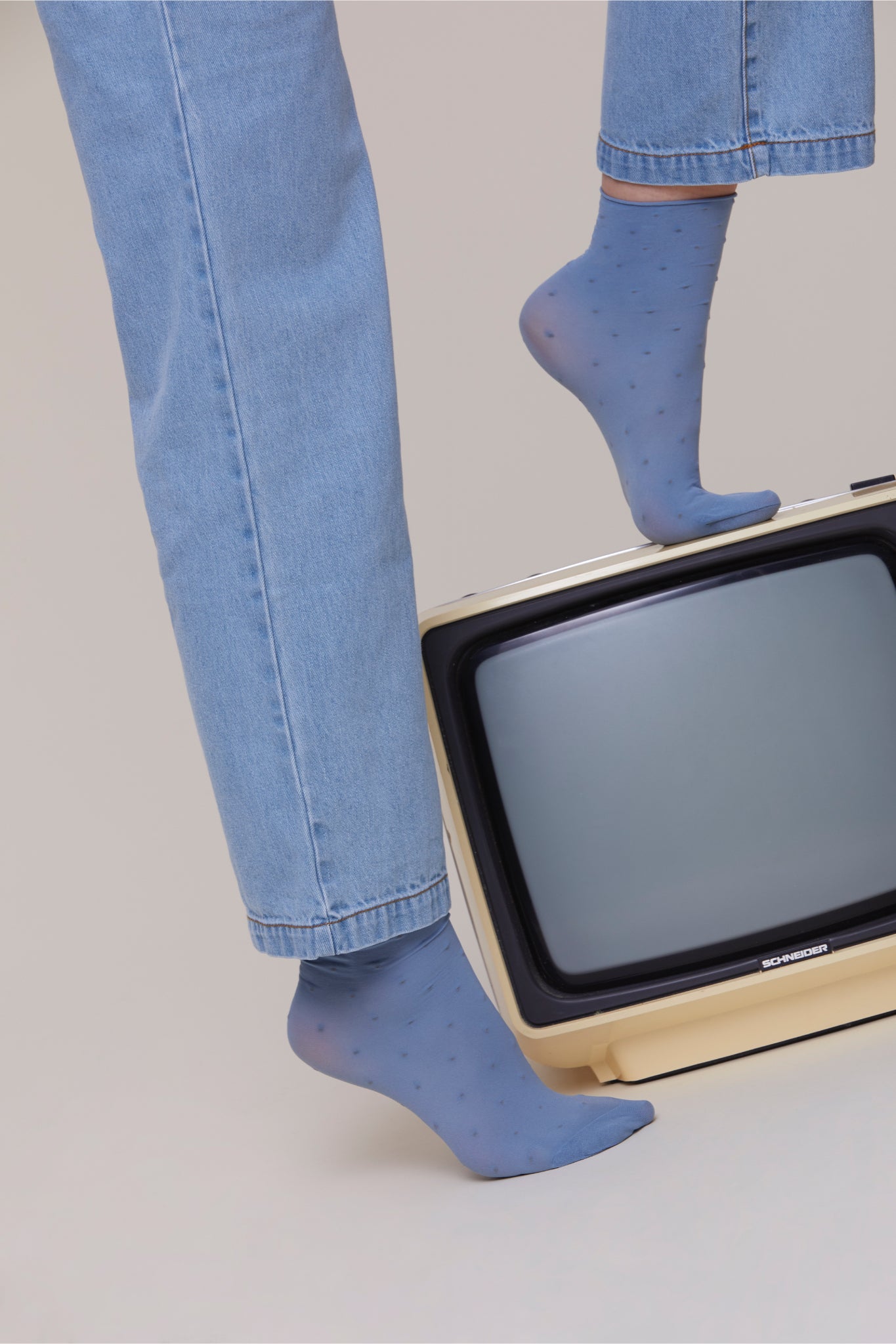 You've got this from head to toe! Semi sheer but completely transparent when it comes to ethics. These elegant socks that have been made with recycled yarn feature a dot pattern and a roll edge as a wonderful finishing touch. This one pack has one dusty blue pair and one ivory pair.