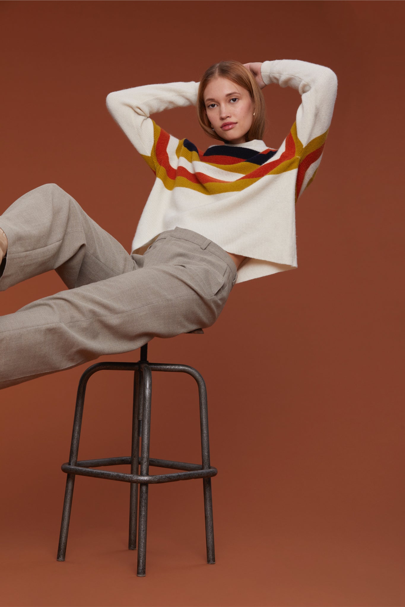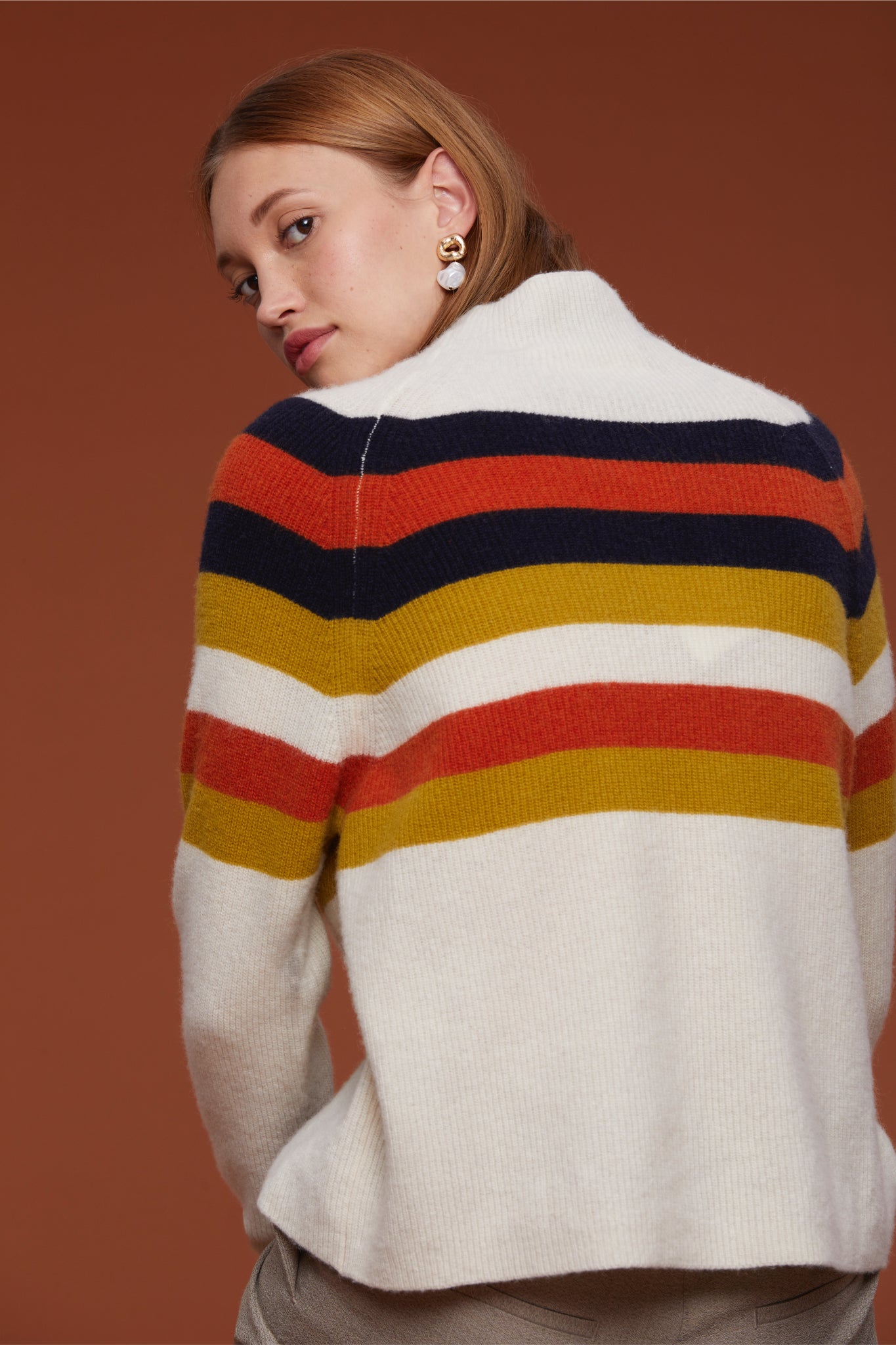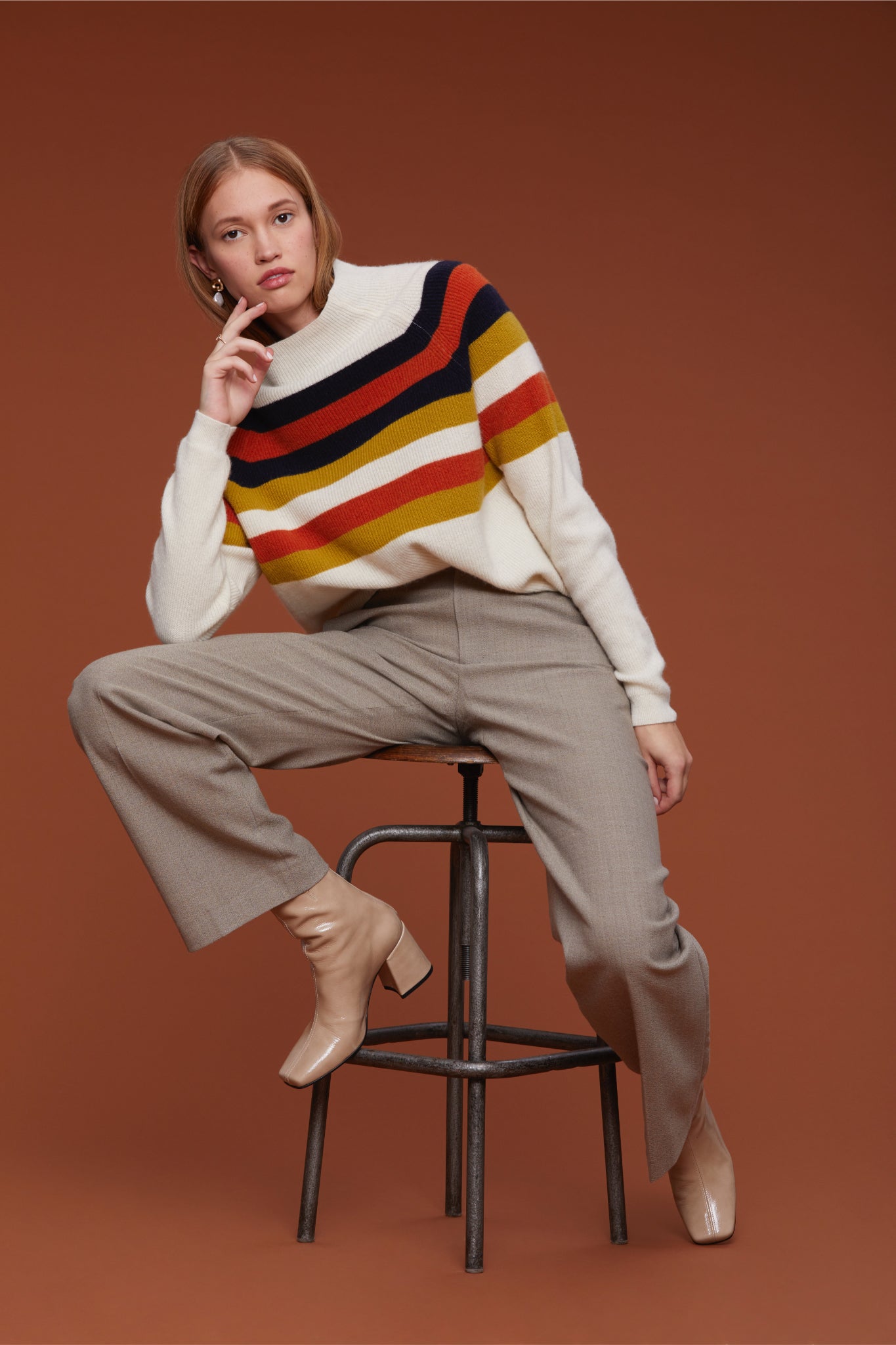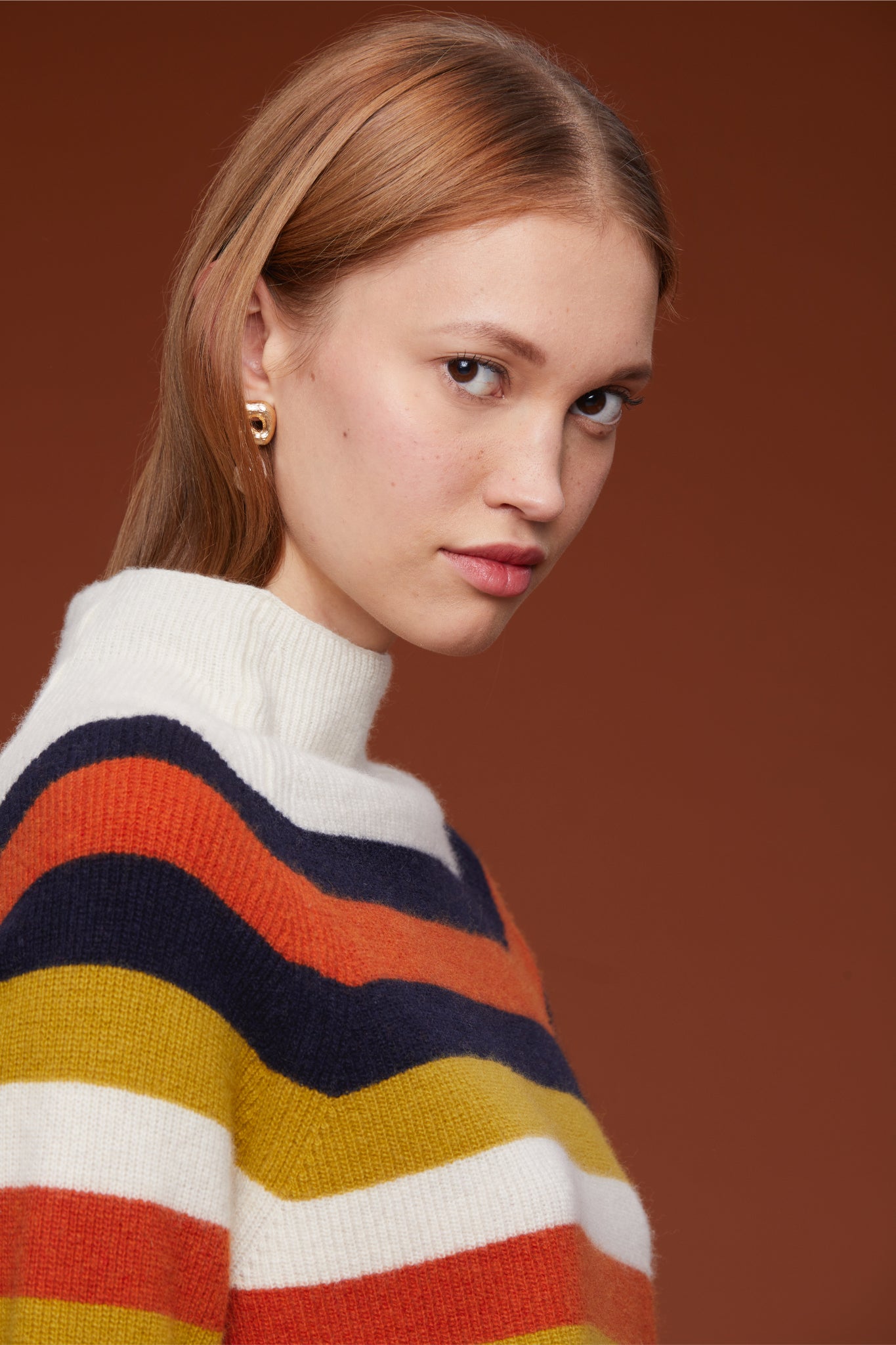 Get to know the Anori. A turtleneck jumper in a luxurious merino wool with a stripe that will make you think of the groovy 70s, the humble living room and wallpapers galore.